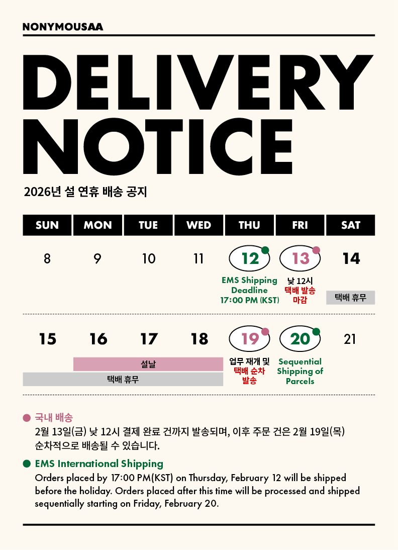 * 2월 설 연휴 기간에 NONYMOUSAA 고객센터 및 배송업무가 중단됩니다.